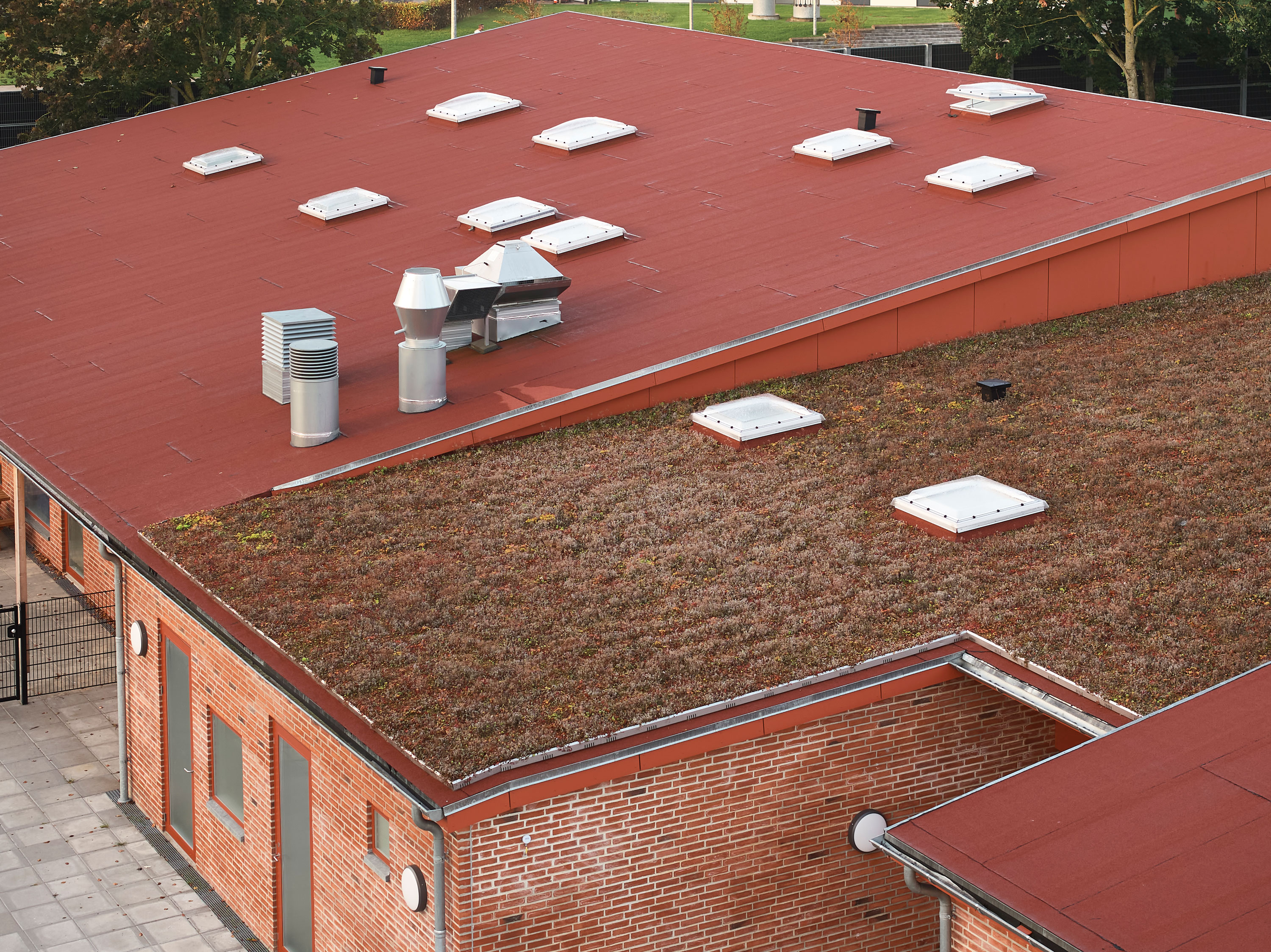 Phønix Tag Nordjylland har leveret en komplet tagløsning med sedumtag, teglrødt tagpap og solceller.