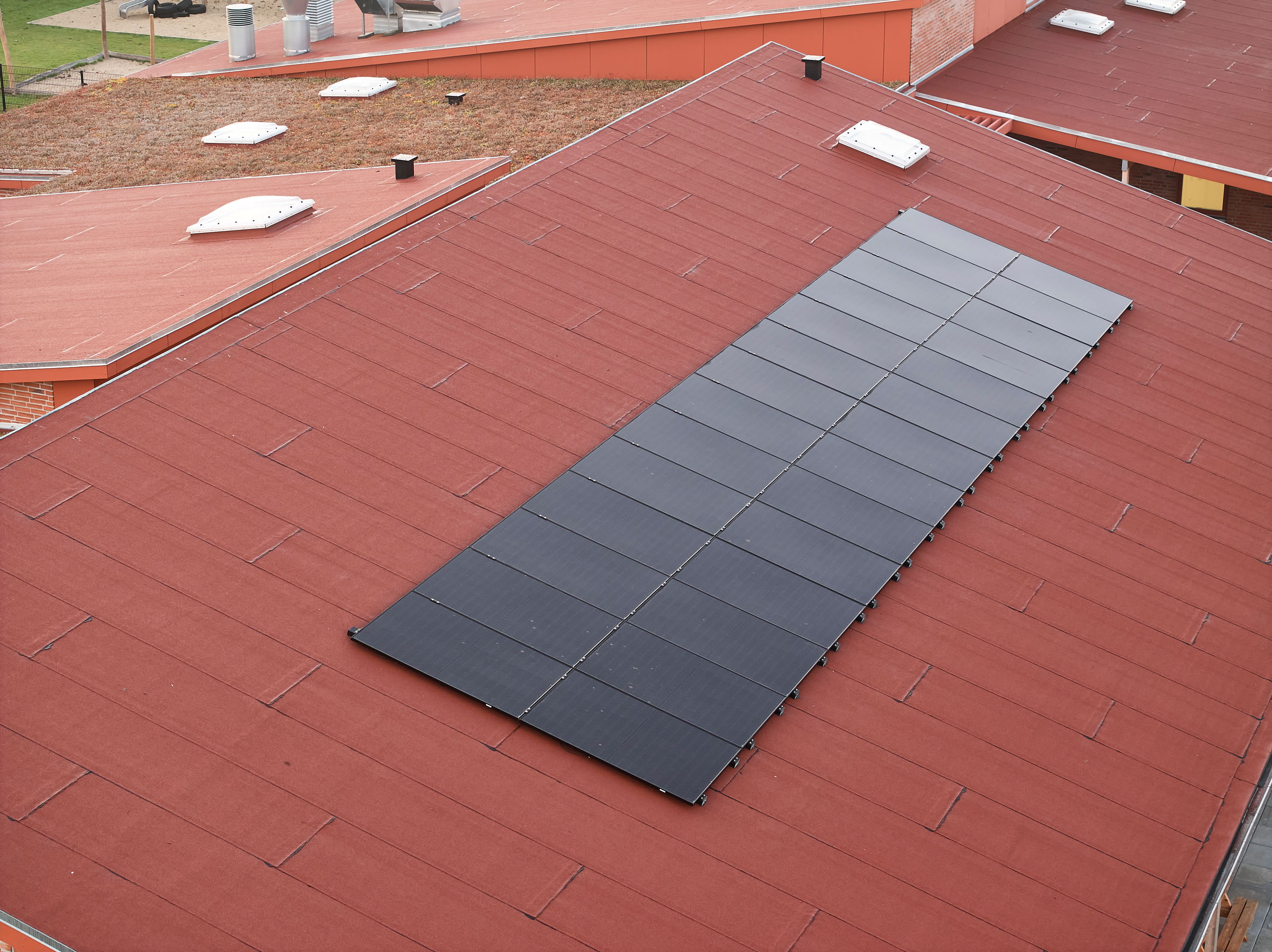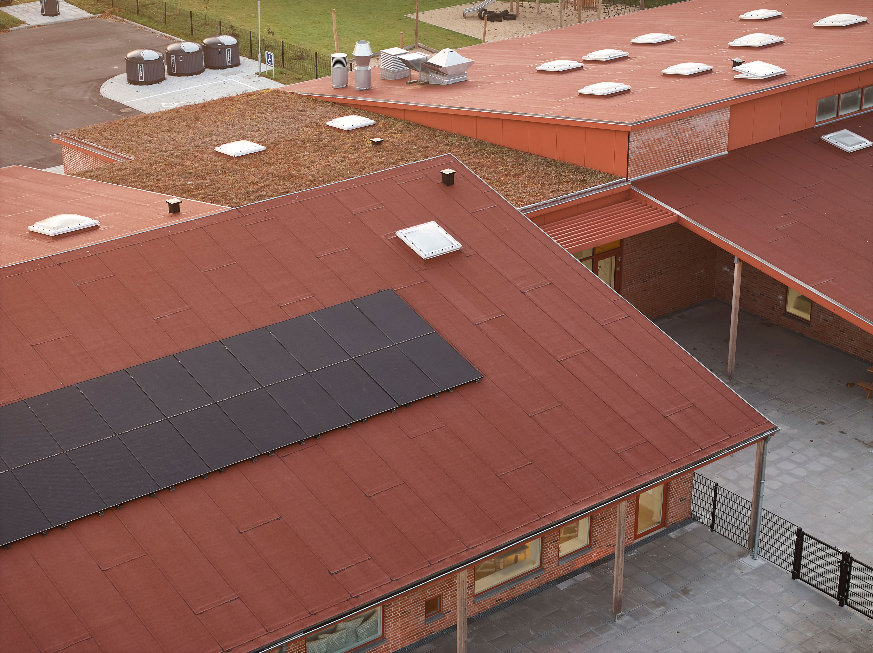Flere af børnehavens tagflader har solceller, der producerer energi til bygningens drift. Solcellerne er monteret med Phønix Tags patenterede montageløsning PWP, der ikke gennembryder tagmembranen.