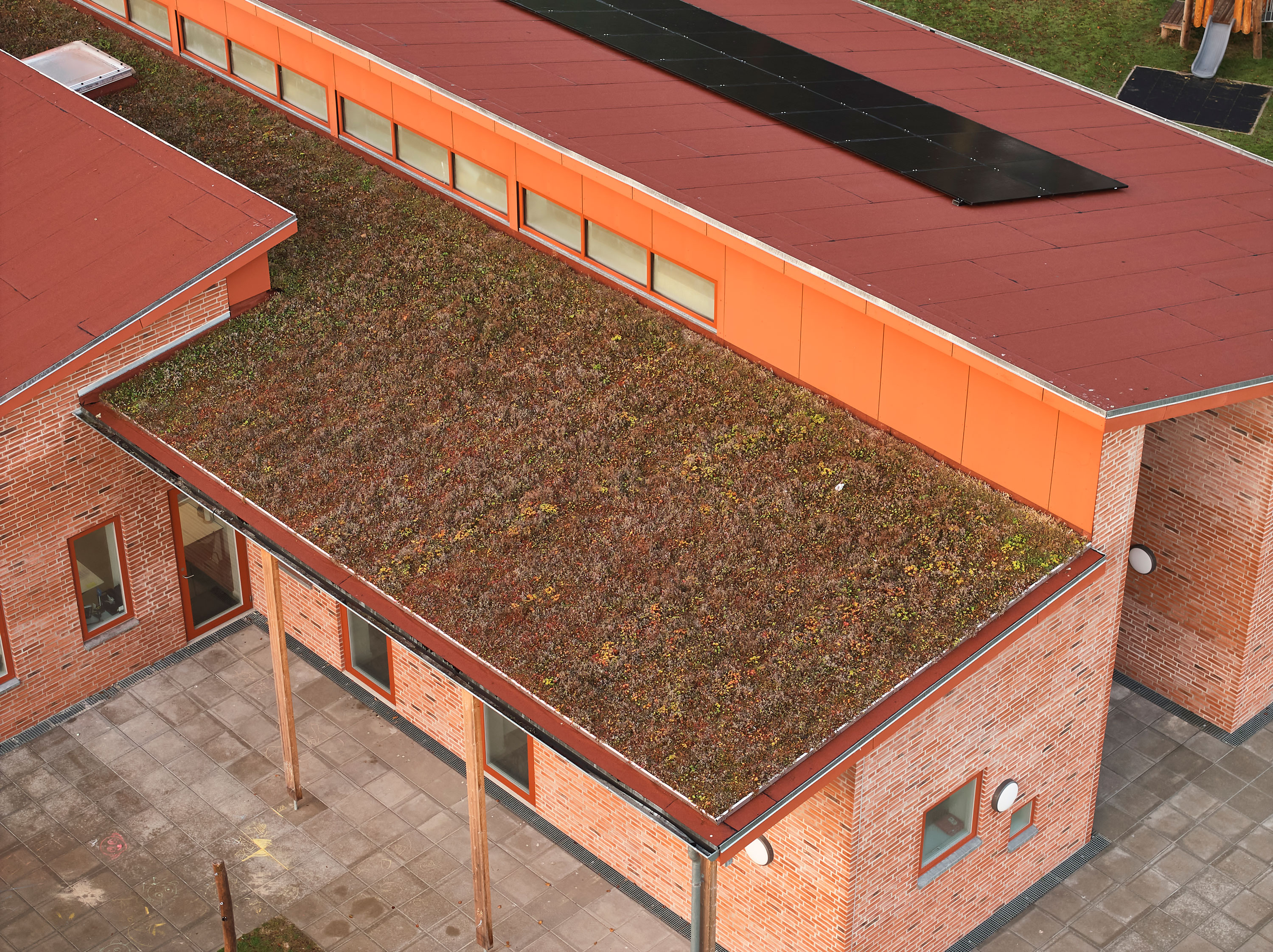 De grønne tagflader får et legende modspil af de øvrige tagflader, som er lagt med teglrødt tagpap, der sammen med bygningens røde mursten og vinduesrammer fremhæver de grønne omgivelser.