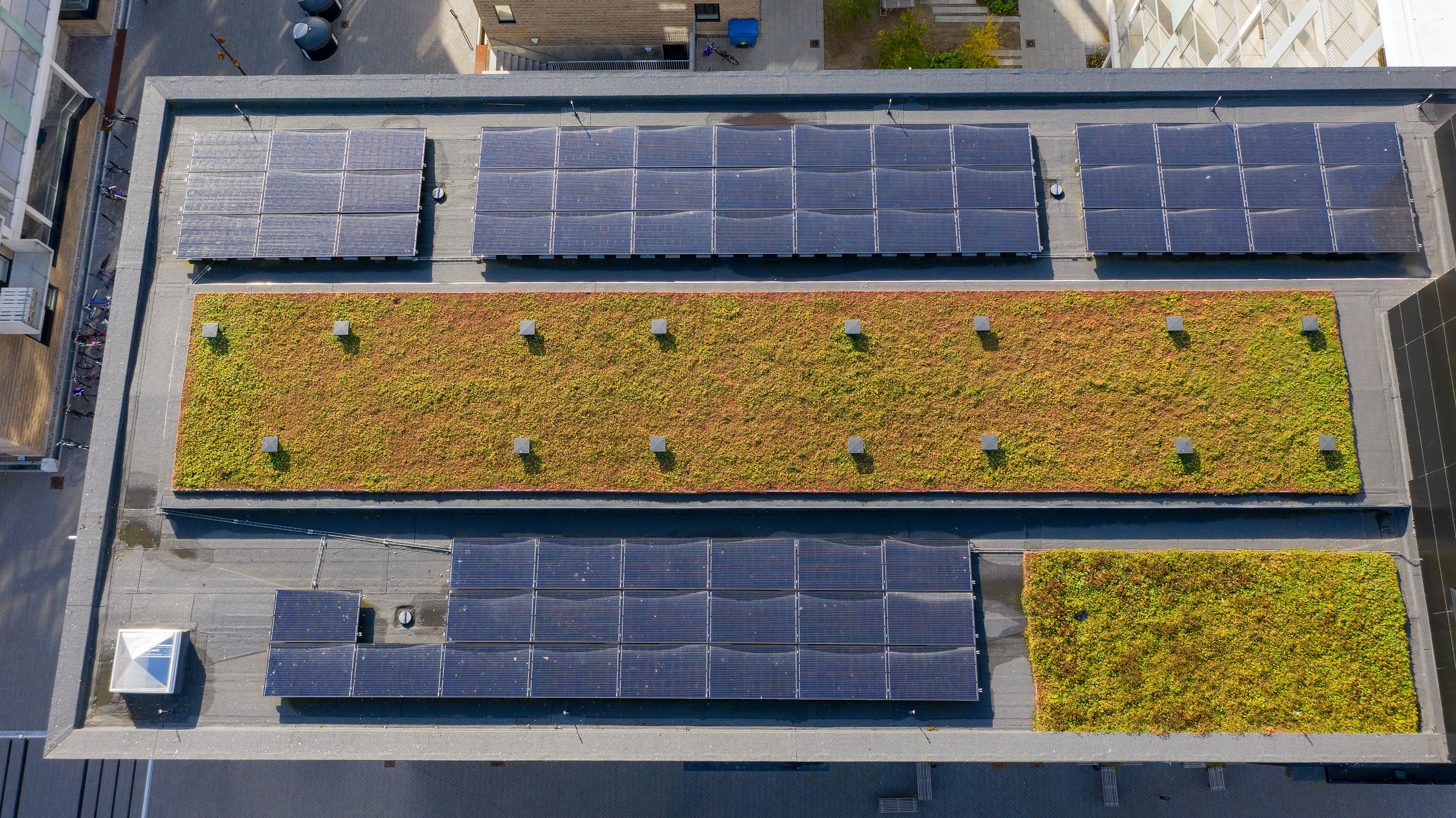 Derudover har de udført tagterrasser og Phønix Tag Energi har monteret solcelleanlæg på taget. Solcelleanlægget er ikke synligt fra gaden, men billederne viser det flotte samspil, der er mellem solcellerne og sedum taget. En løsning som denne viser netop mulighederne med at kombinere klimatilpasning (det grønne tag) samt vedvarende energi (solcellerne).