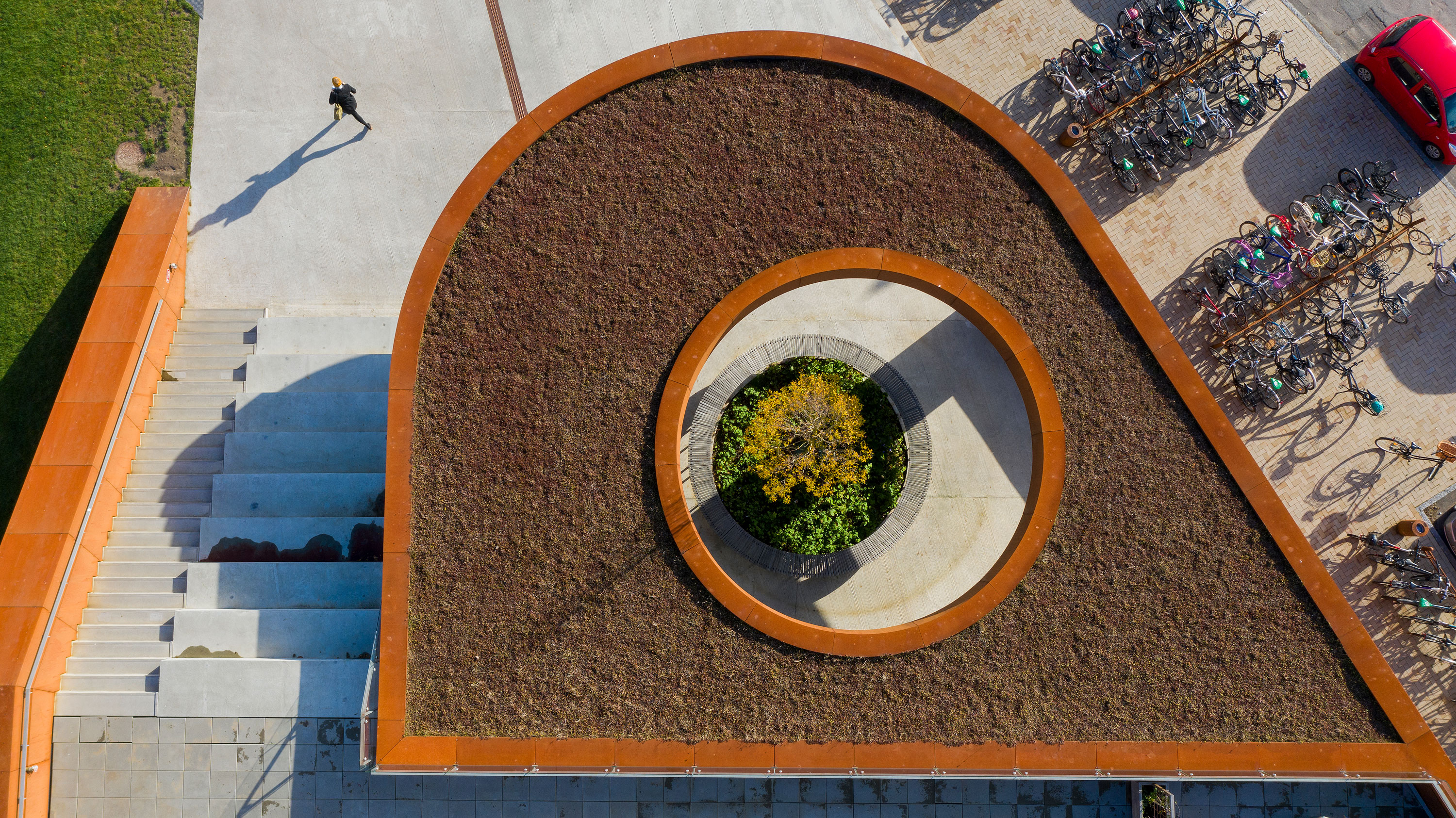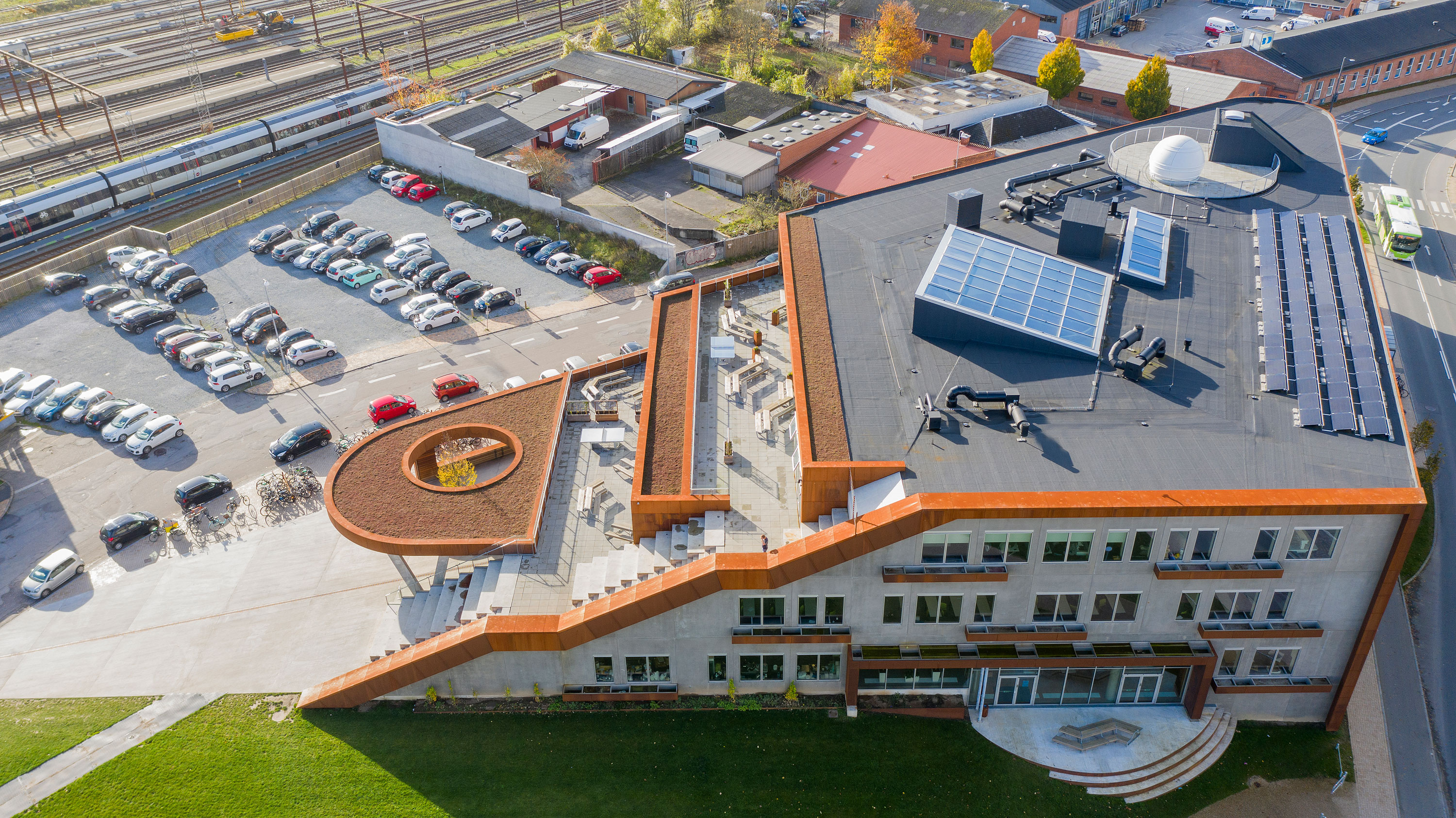 Den sorte tagpap og sedumtaget supplerer den lys grå beton og den rustfarvede corten-stål optimalt, således at bygningen fremstår markant, men alligevel falder flot ind i omgivelserne.