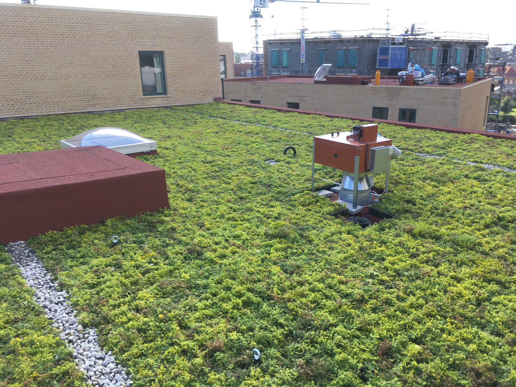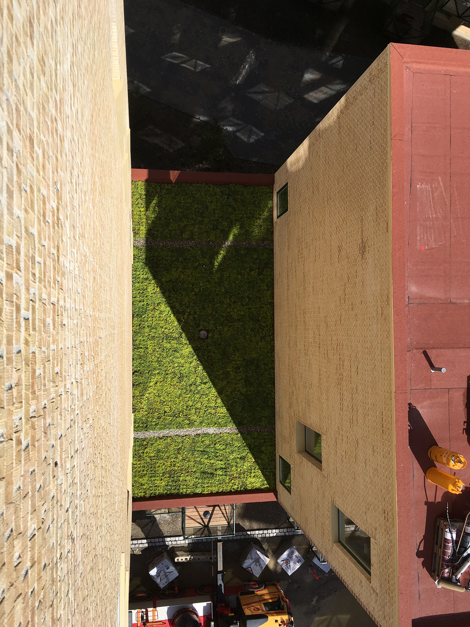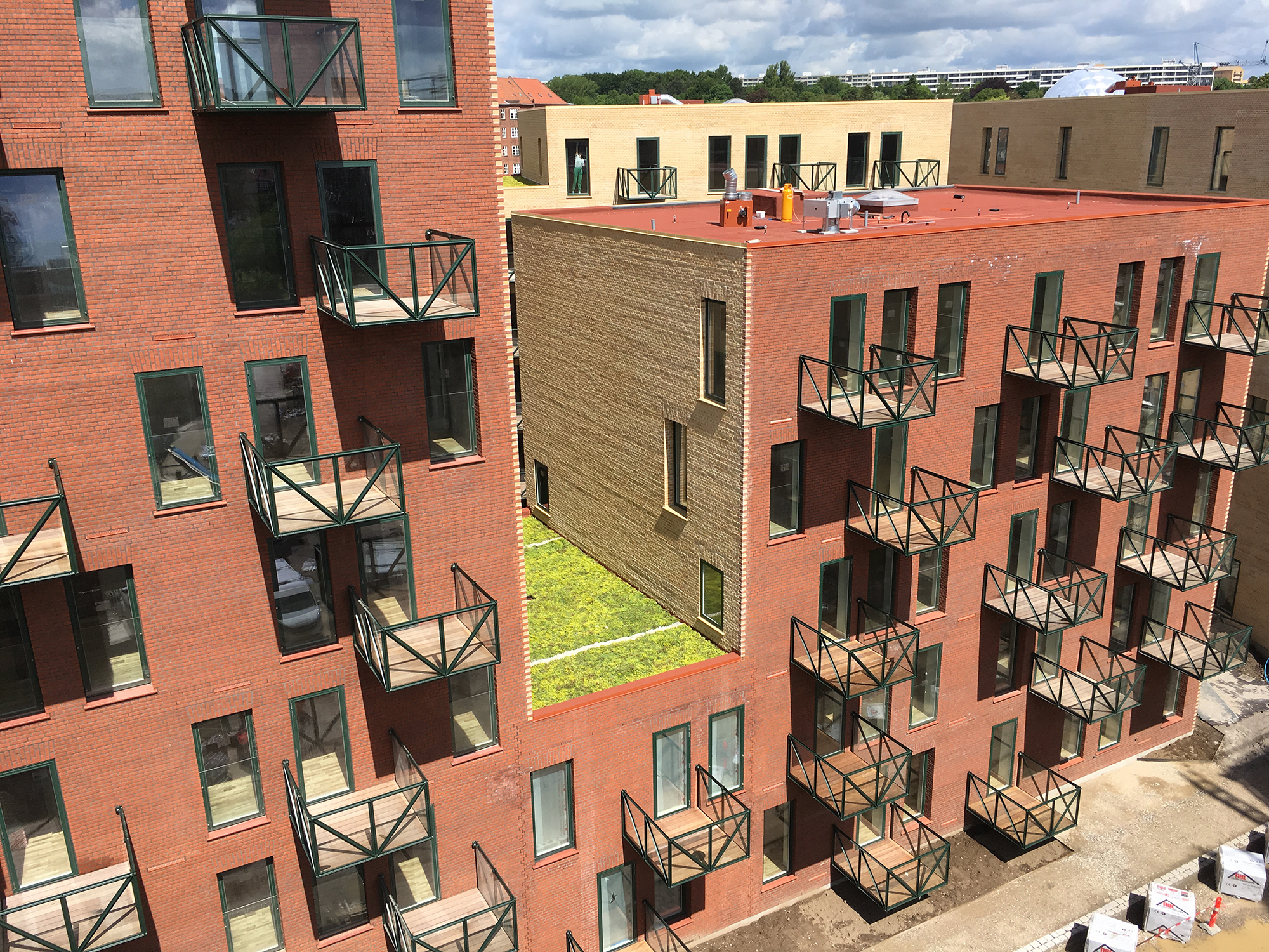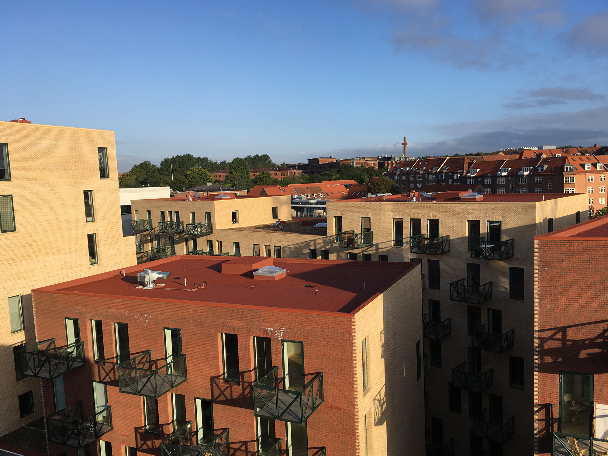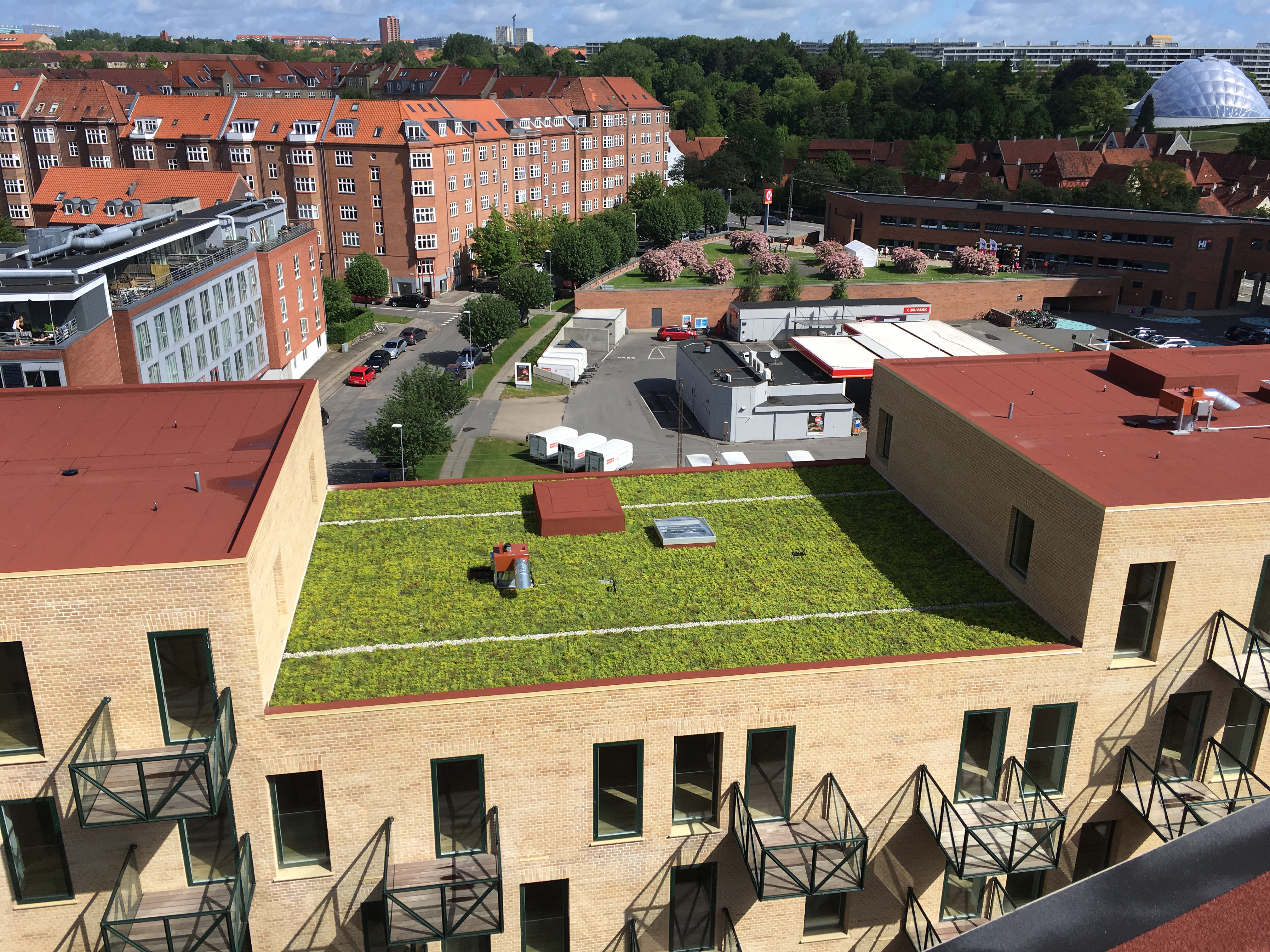 I Lottrupgården i Ceresbyen i Aarhus har arkitekten valgt tagpap i rød farve. Tagfladen understøtter dermed bygningernes bevidst storbyagtige udtryk – og skift mellem forskellige farver.