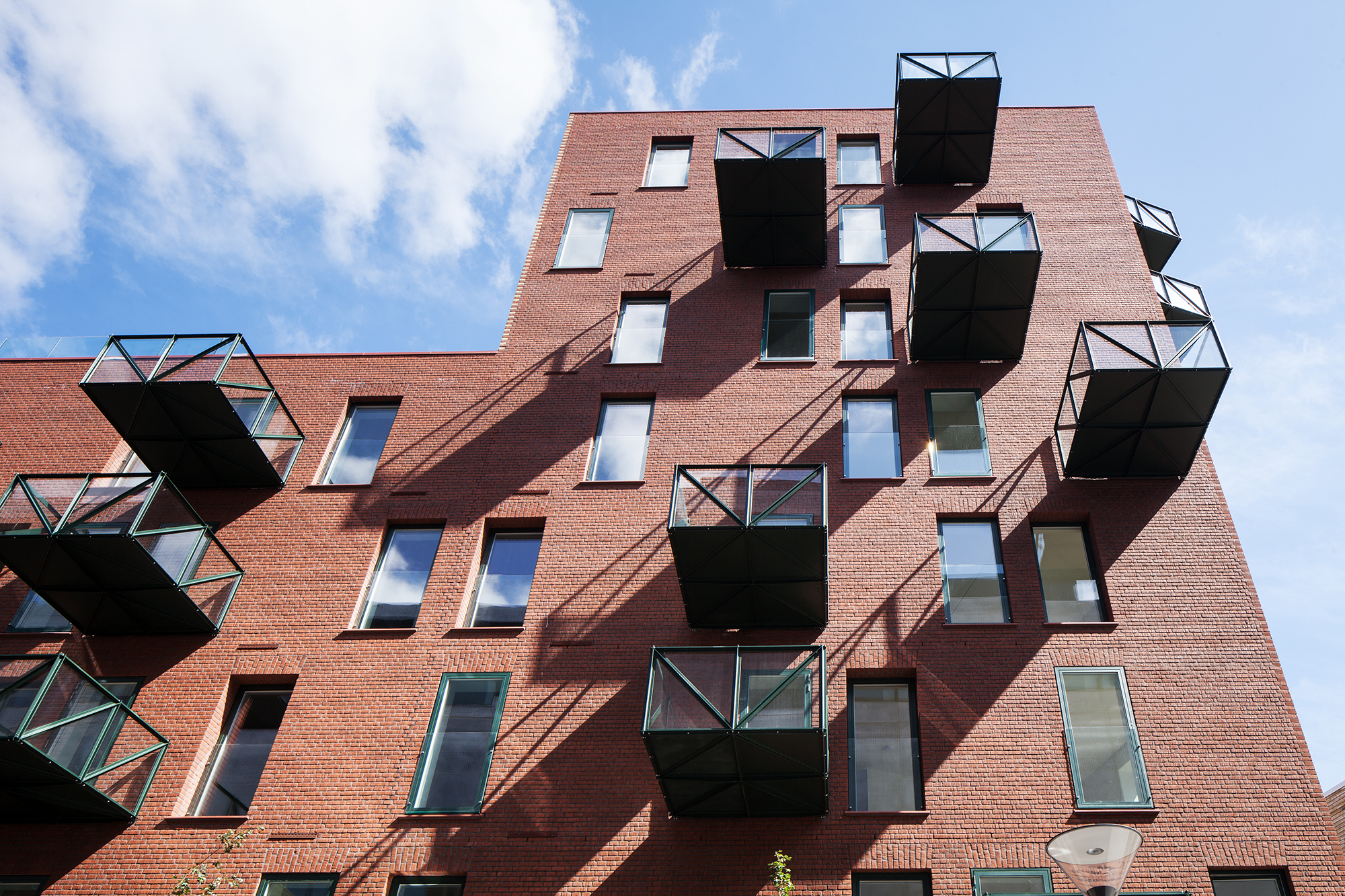 I den gennemtænkte arkitektur er der bevidste etagespring mellem to og otte etager, der visuelt virker som en slags skydeskår. Det giver variation og en levende tagprofil. Derved trækker bygningen forskellige højder og silhuetter himmelrummet ind i gården.