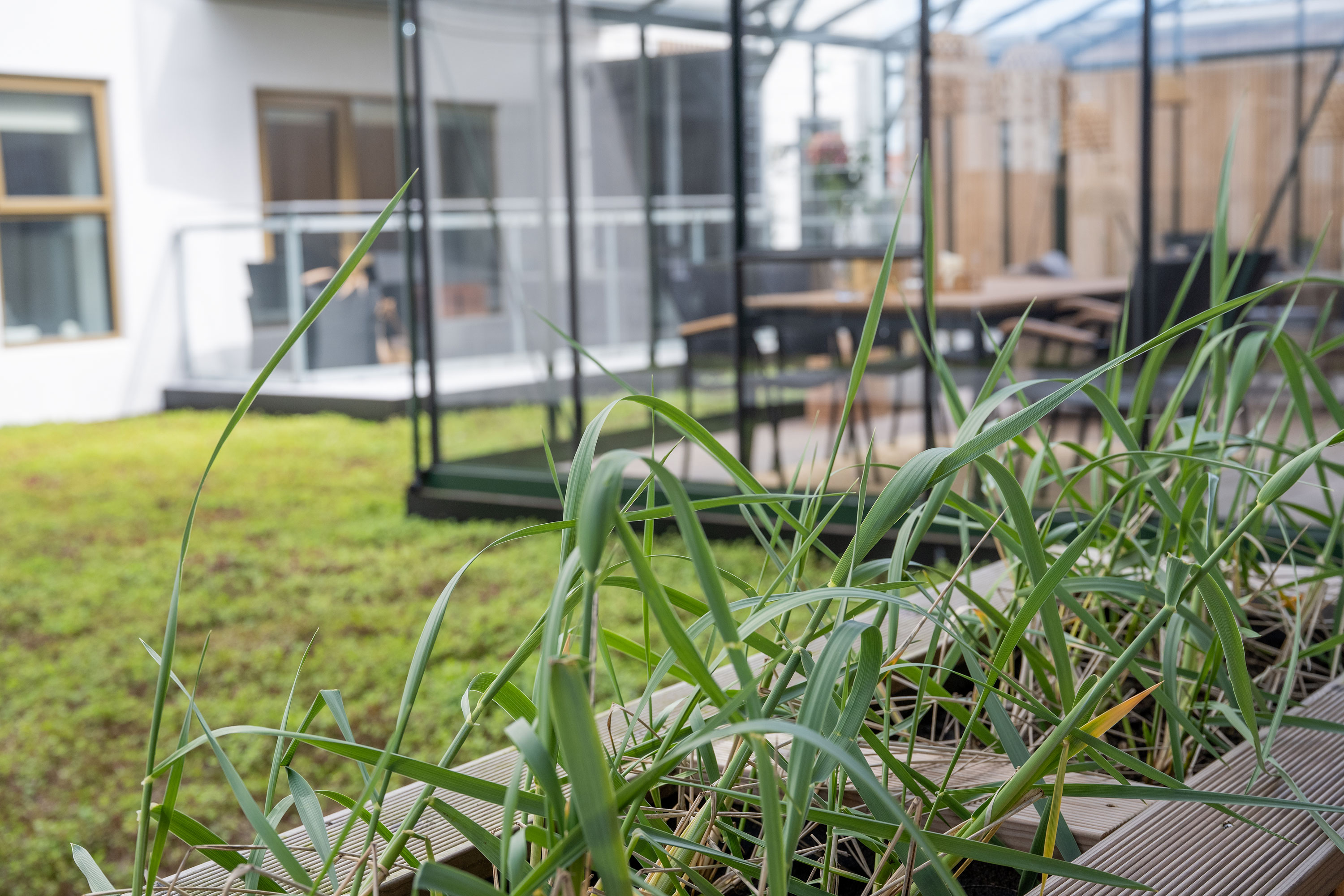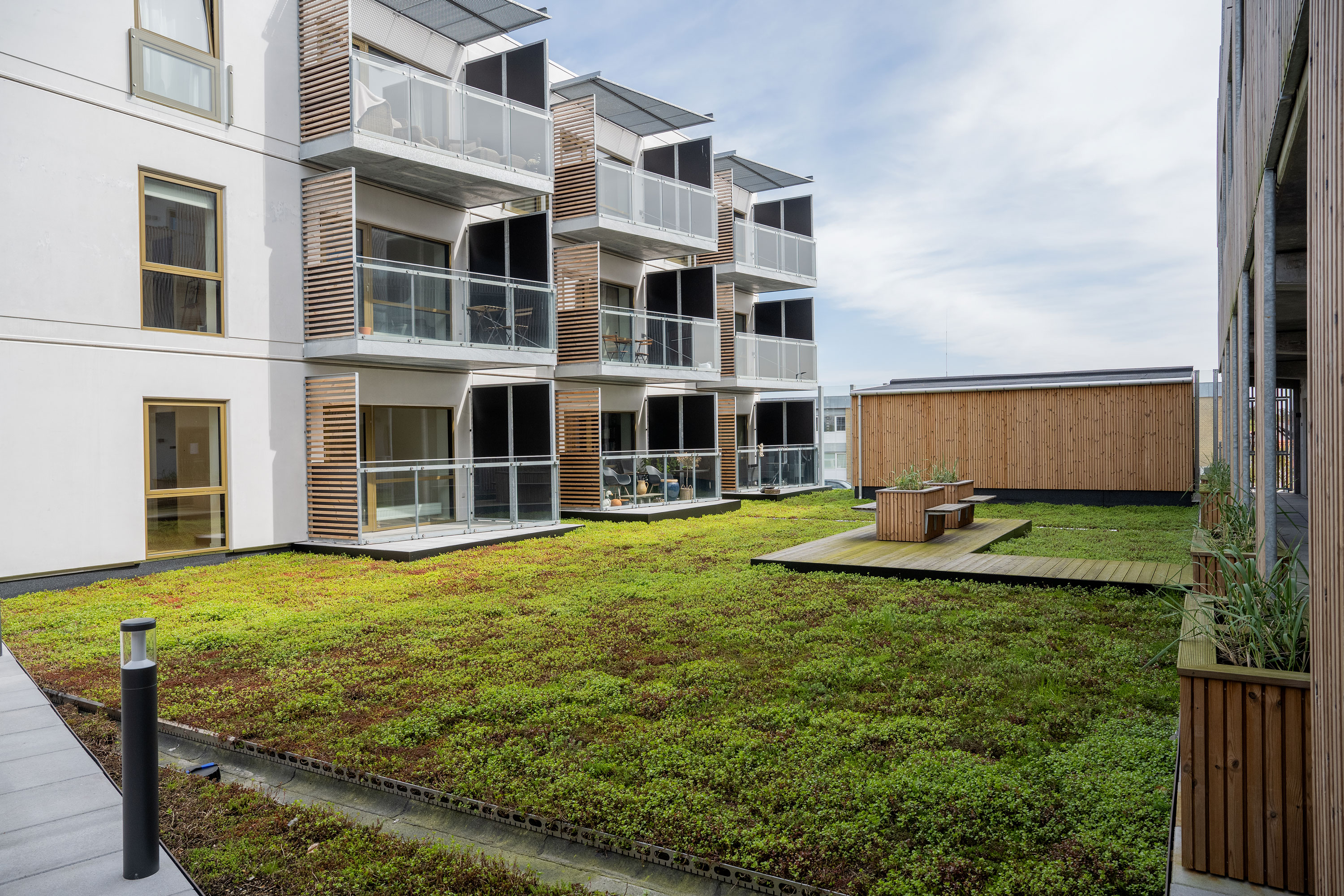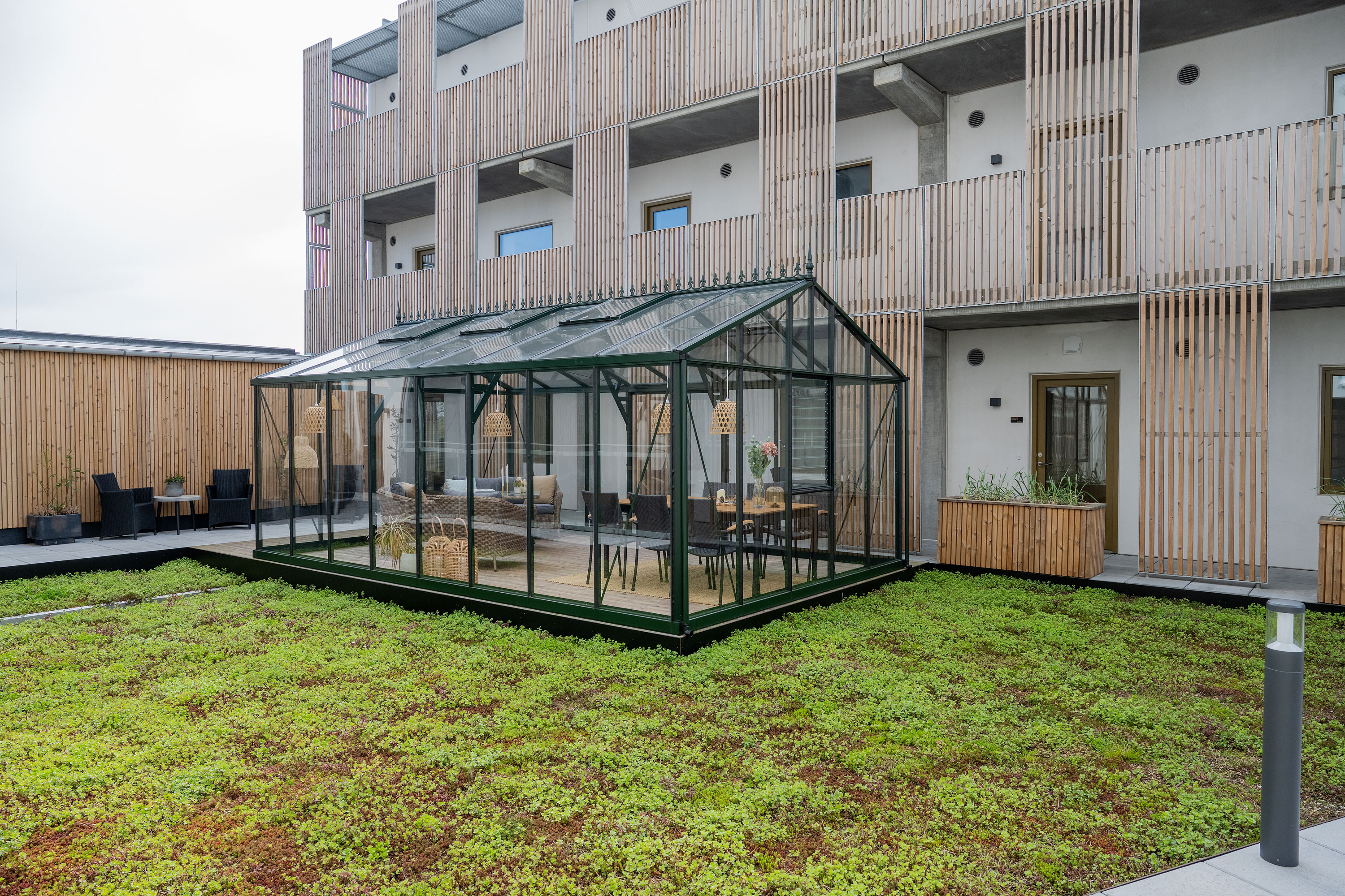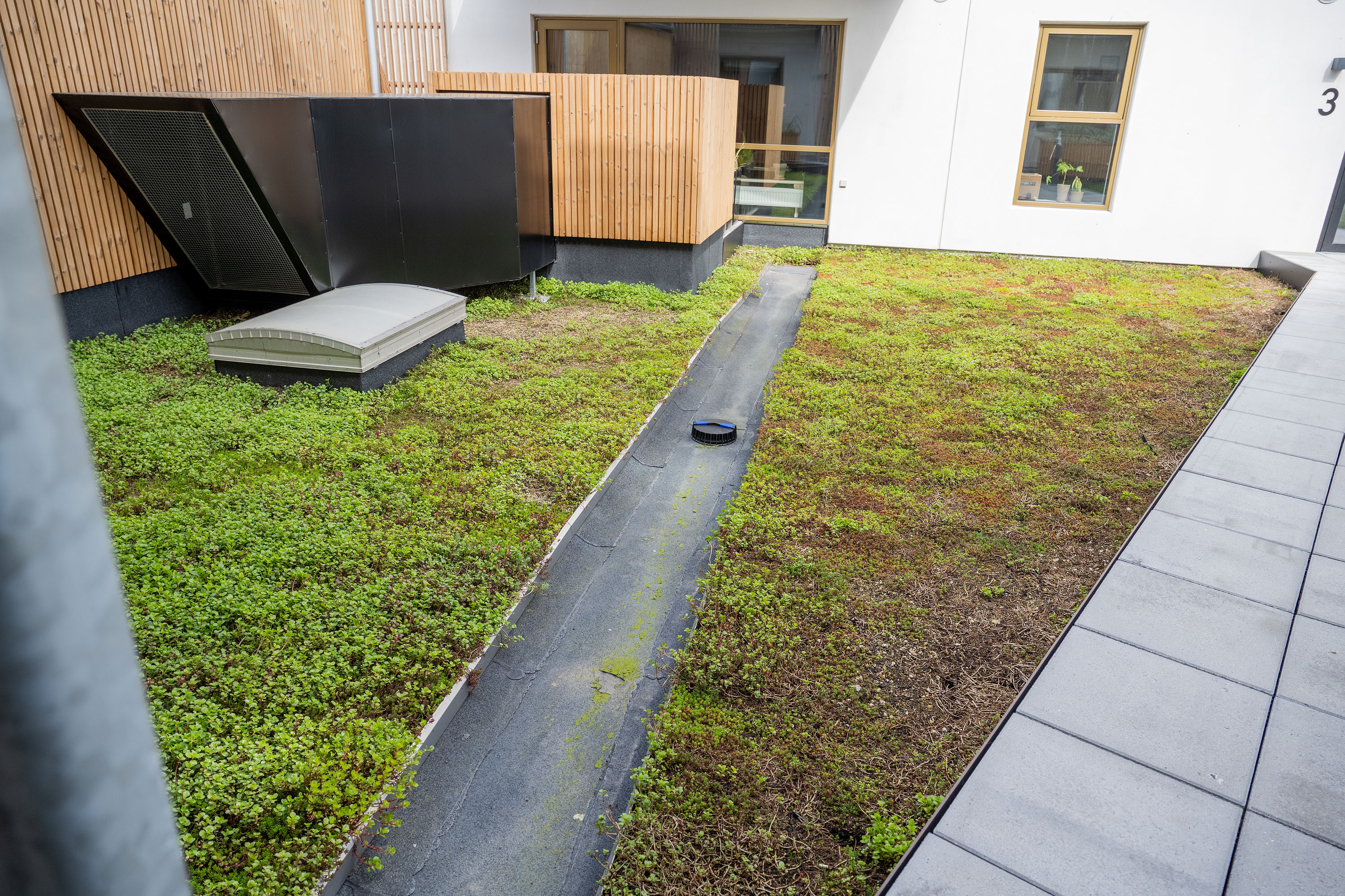 ”Vi har lavet en løsning, hvor planterne gror i bakker ovenpå tagpap. Planterne giver et hyggeligt gårdmiljø og så optager sedum jo en del regnvand. På den måde er det tænkt ind som både en del af bygningens klimasikring og som noget, der giver stemning og miljø for beboerne,” siger Rasmus Kallestrup Johansen.