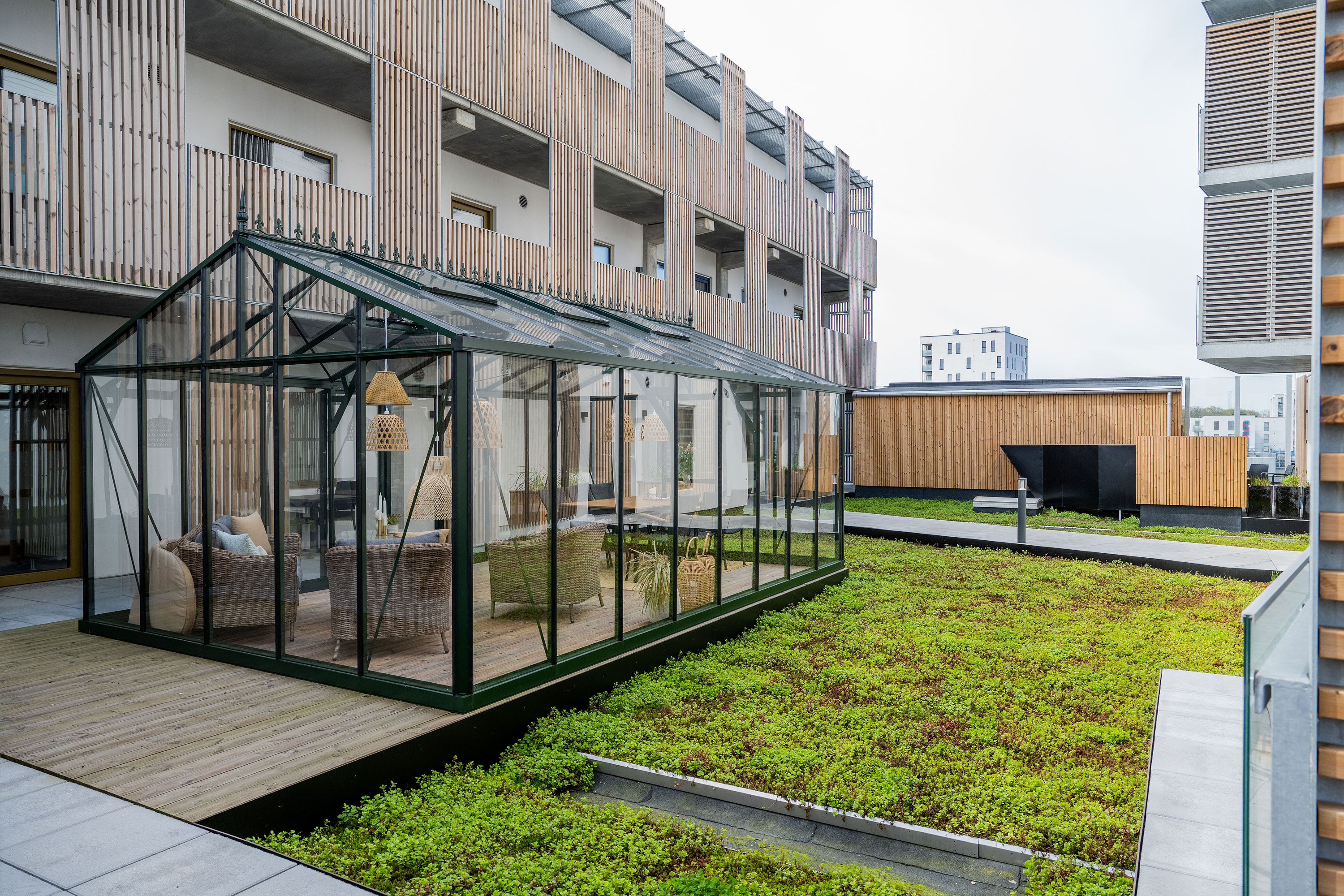 Da lejlighedskomplekserne til sidst stod sikkert og godt oven på butikscenteret, gik næste fase af opgaven for Phønix Tag Nordjylland i gang. Nemlig etablering af to taghaver på fladerne mellem de tre bygninger. I alt er monteret 2.940 m2 tagdækning på Central Park Living.