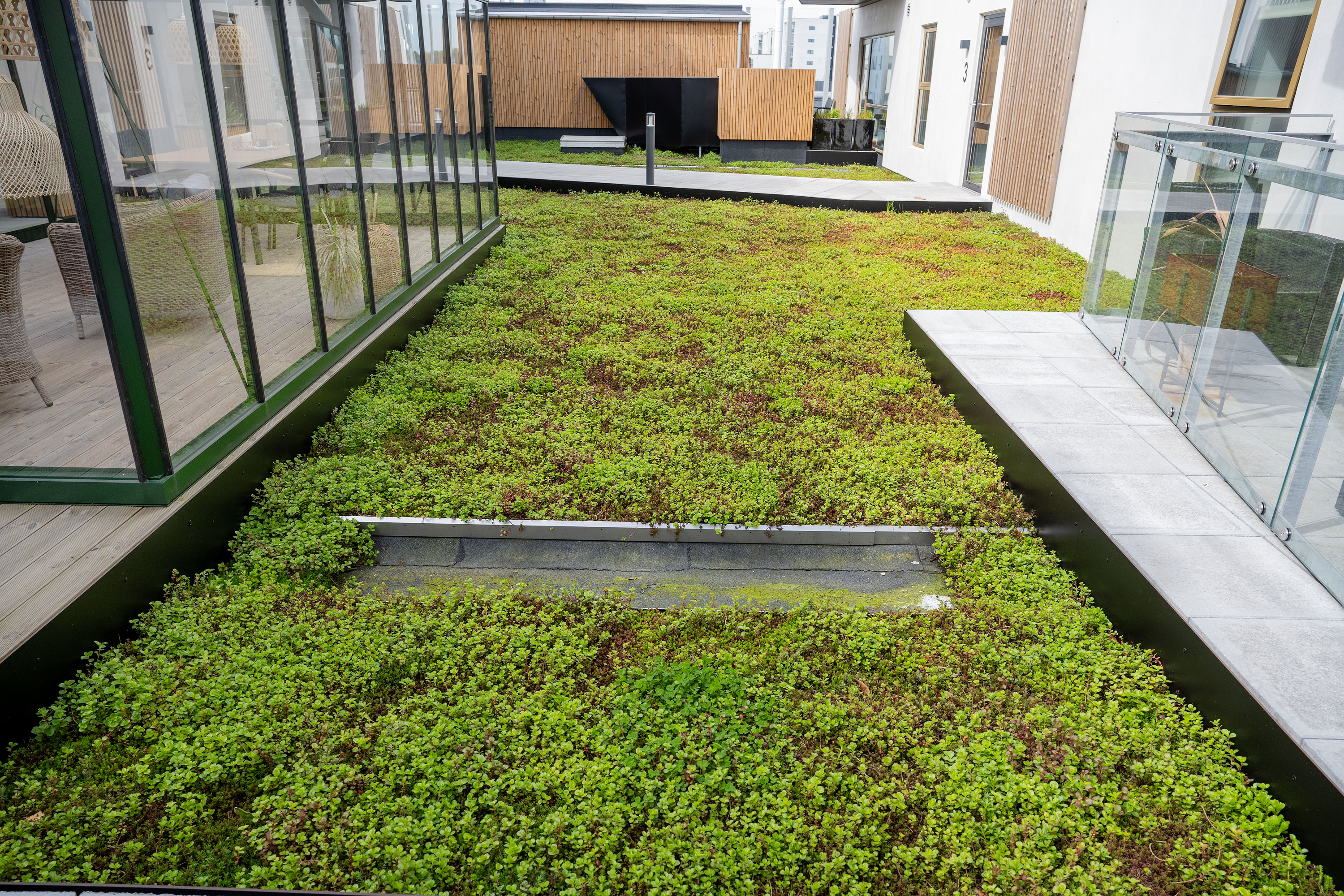 Tagpap er det solide og tætte underlag, der beskytter betonkonstruktionen. Bunddækket af sedumplanter optager effektivt regnvand og holder på det, indtil det fordamper naturligt. Dermed reduceres vandafløbet fra taget med op til 50%, hvilket er med til at forhindre overbelastede kloakker og oversvømmelser under skybrud.