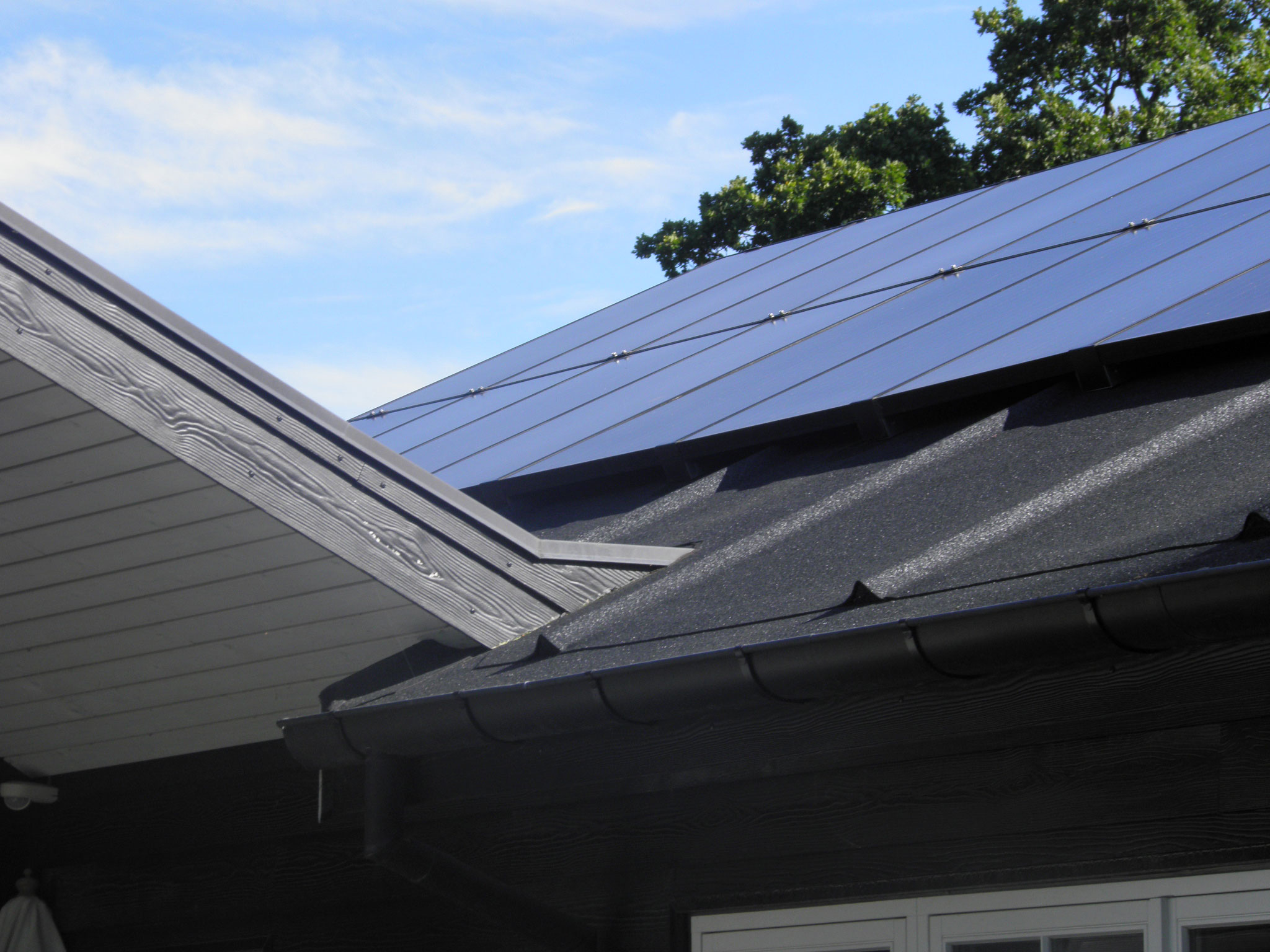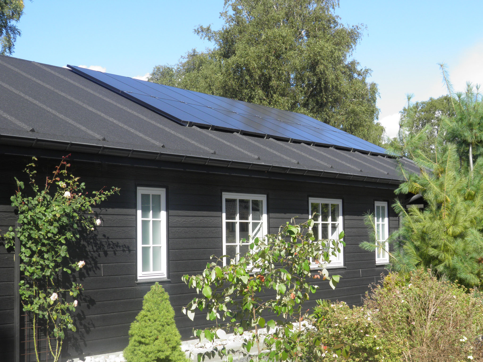 På dette sommerhus ser man tydeligt, hvor smukt at et solcelleanlæg til sommerhus kan kombineres med en listedækning.