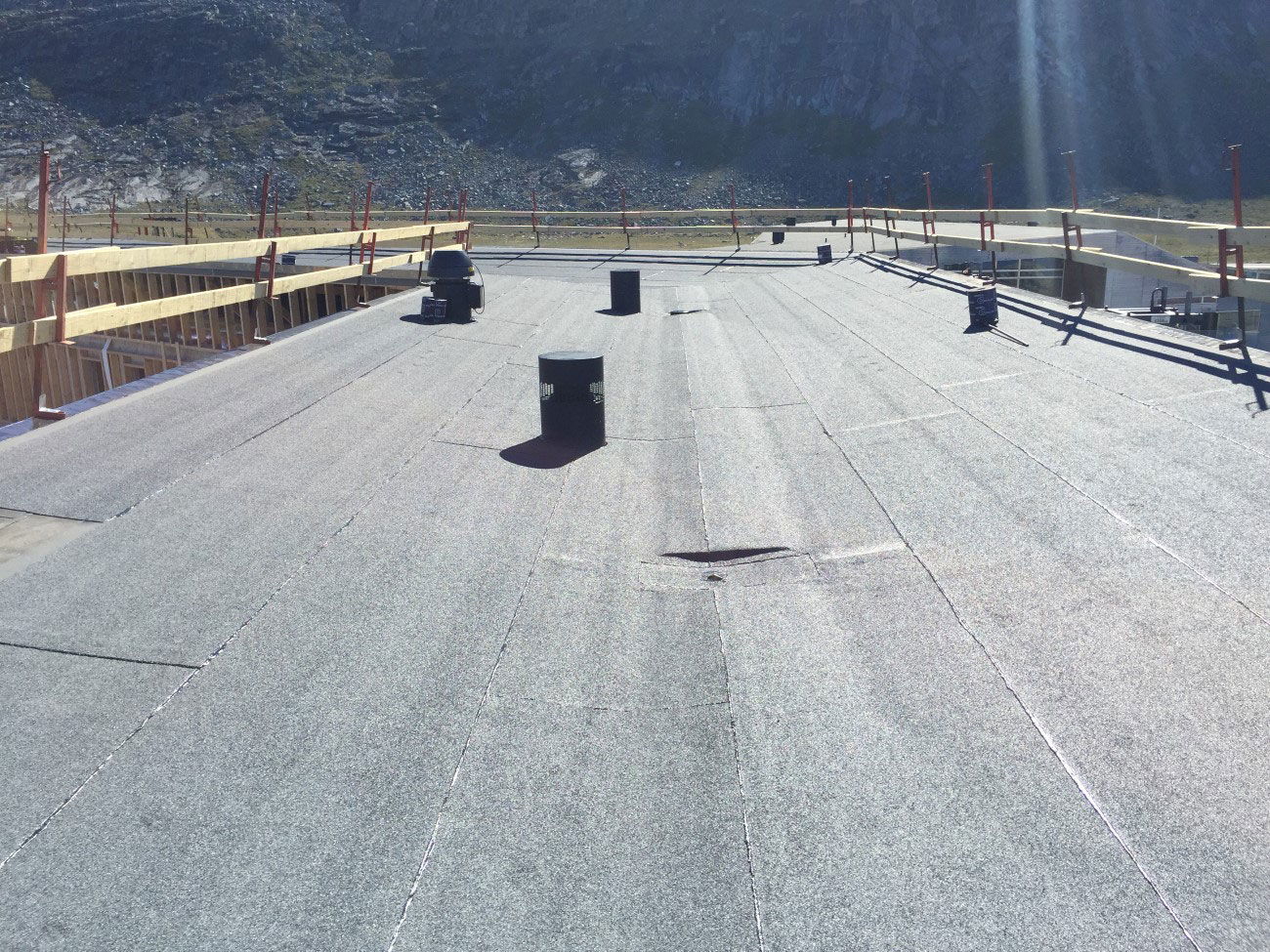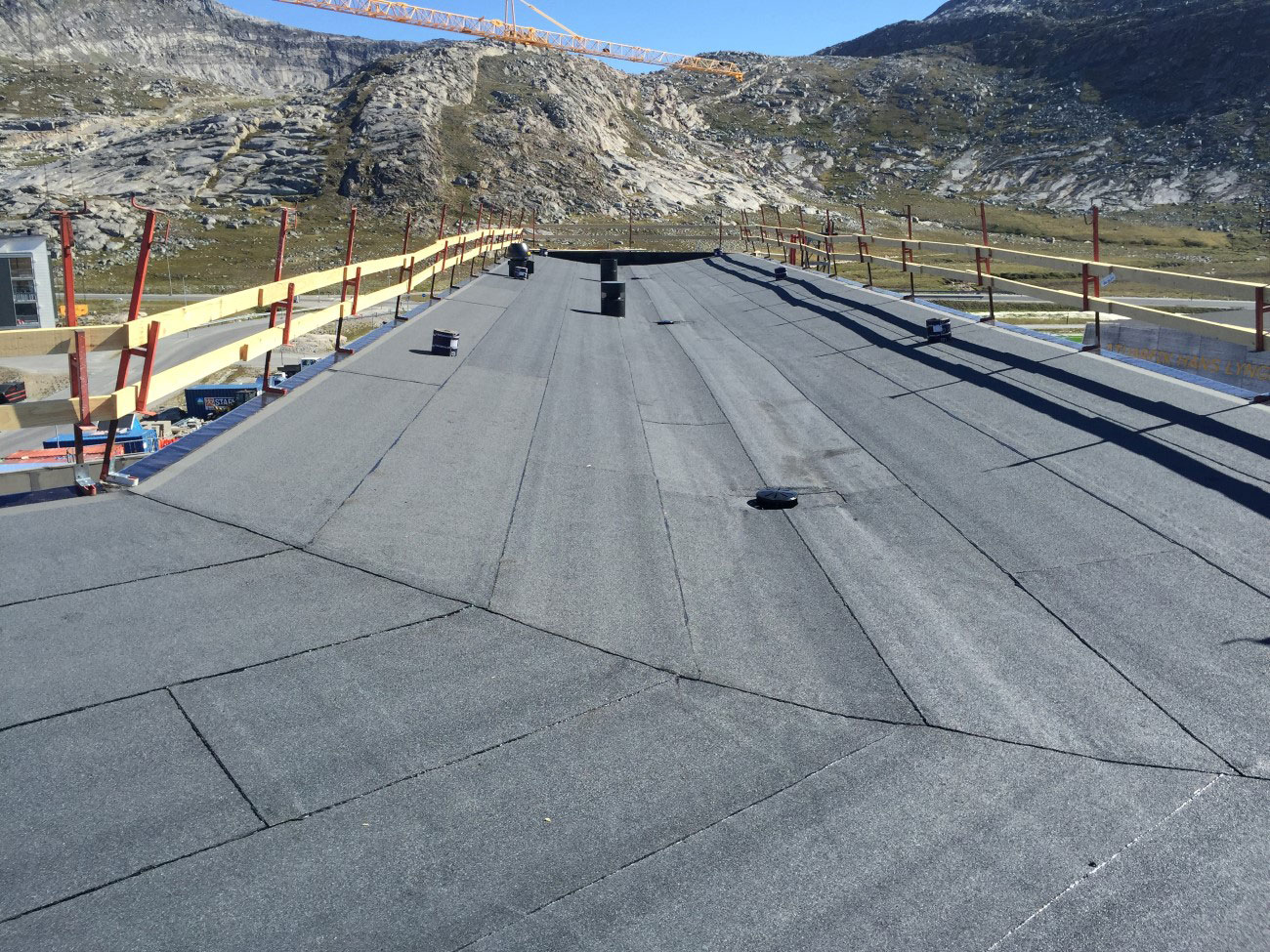 I alt 670 m2 tagdækning udført med modfaldskiler og 1 lag SBS tagmembran på strimlede Polarplader samt 750 m2 med dampspærre, isolering samt 2 slag SBS tagmembran.