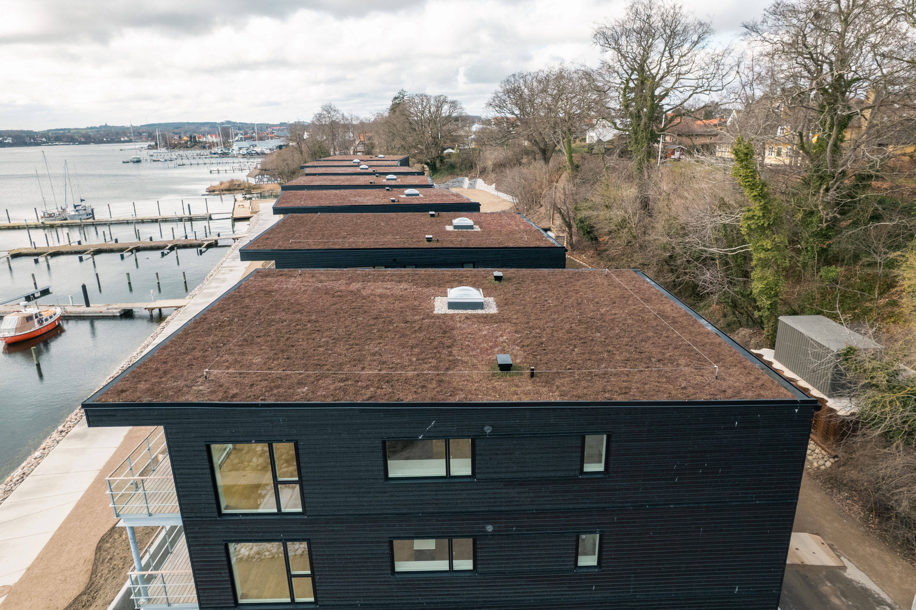 Phønix Tag har haft tagentreprisen på byggeriet, i alt 1.850 m2 tag på de 7 huse, hvor vi på underlag af beton har vi påsvejst dampspærre, udlagt tagisolering, 2 lag tagpap fra Phønix Tag Materialer samt monteret sedumtaget.