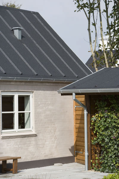 Dette er ikke et nyt hus, men et totalrenoveret hus, hvor tagpappet harmonerer flot med stilen på hele huset, haven og tilbygningerne. Et skoleeksempel på en vellykket renovering, som også blev præmieret i kommunen.