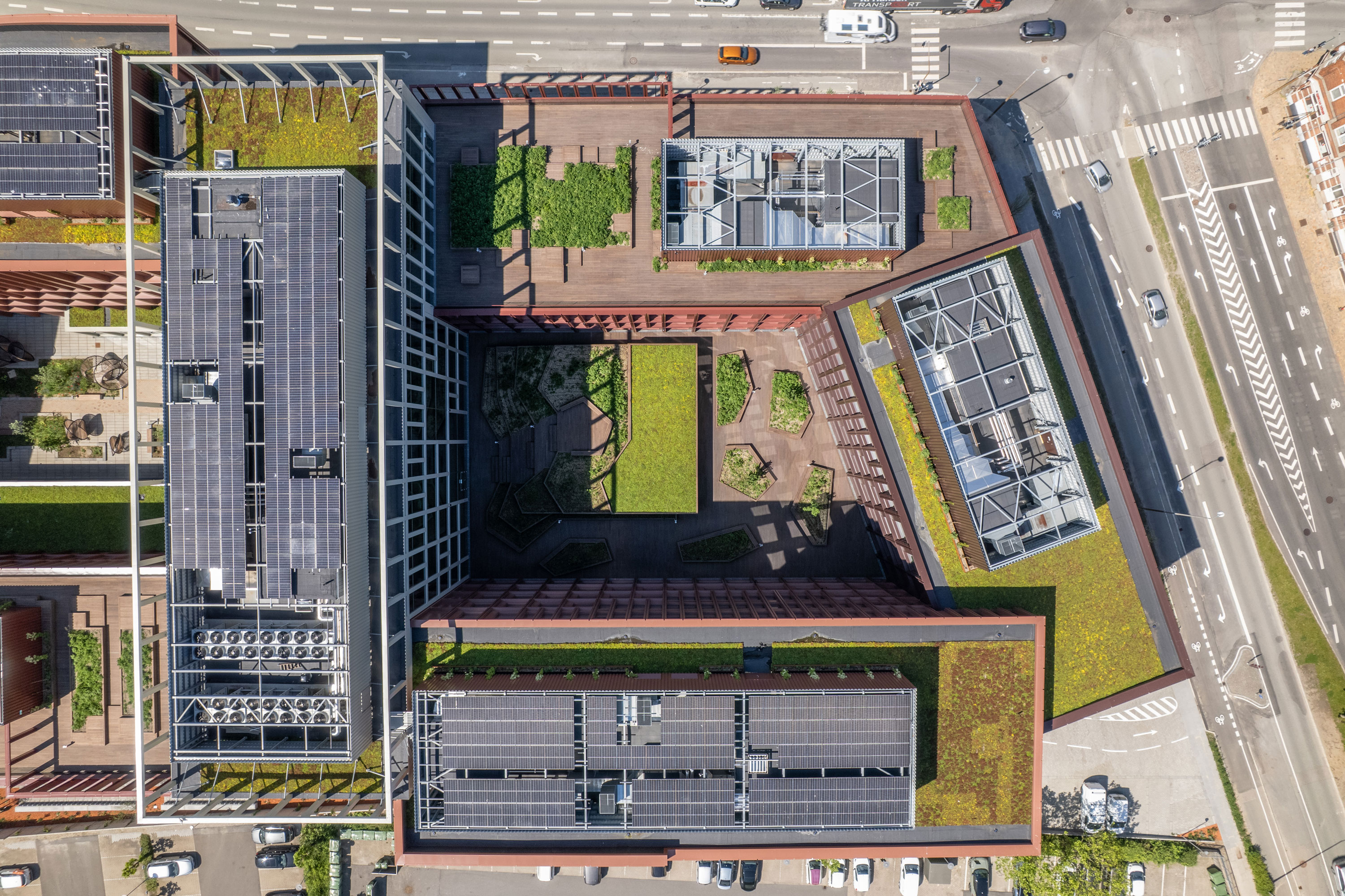 I sin grundstruktur består byggeriet af to forskudte, øst- og vestvendte C-formede kontorfløje på tre til seks etager, der mødes i en syveetages fælles bygningsfløj, hvor størstedelen af mødefaciliteterne er samlet. Facaderne er udført i genbrugsaluminium i rødbrunlige nuancer, der matcher de omkringliggende bygningers teglfacader.
